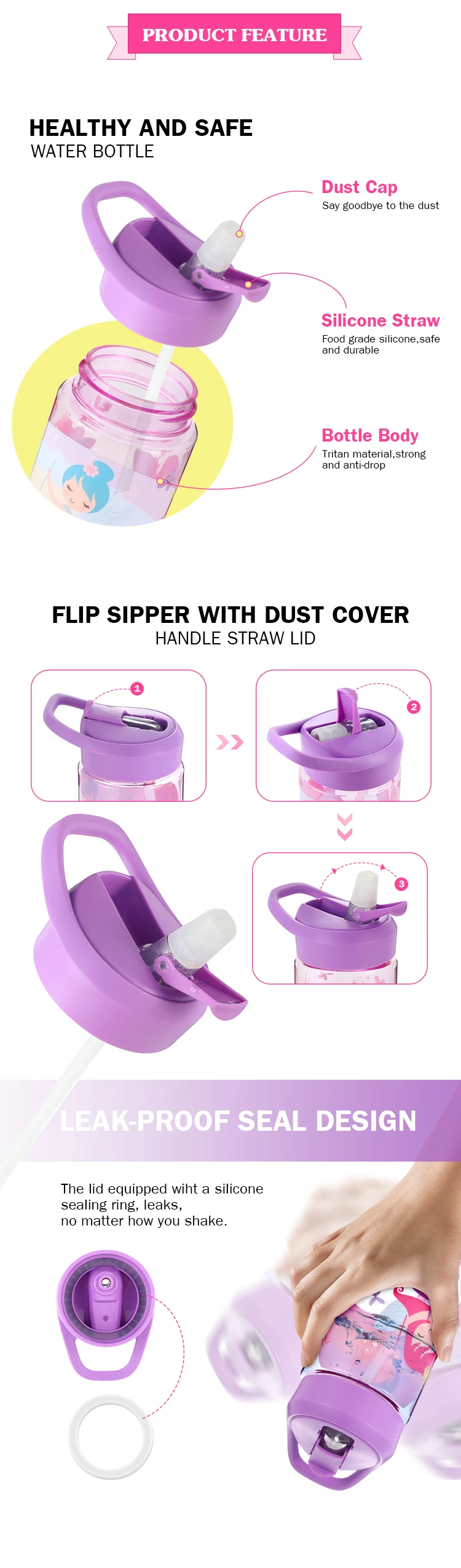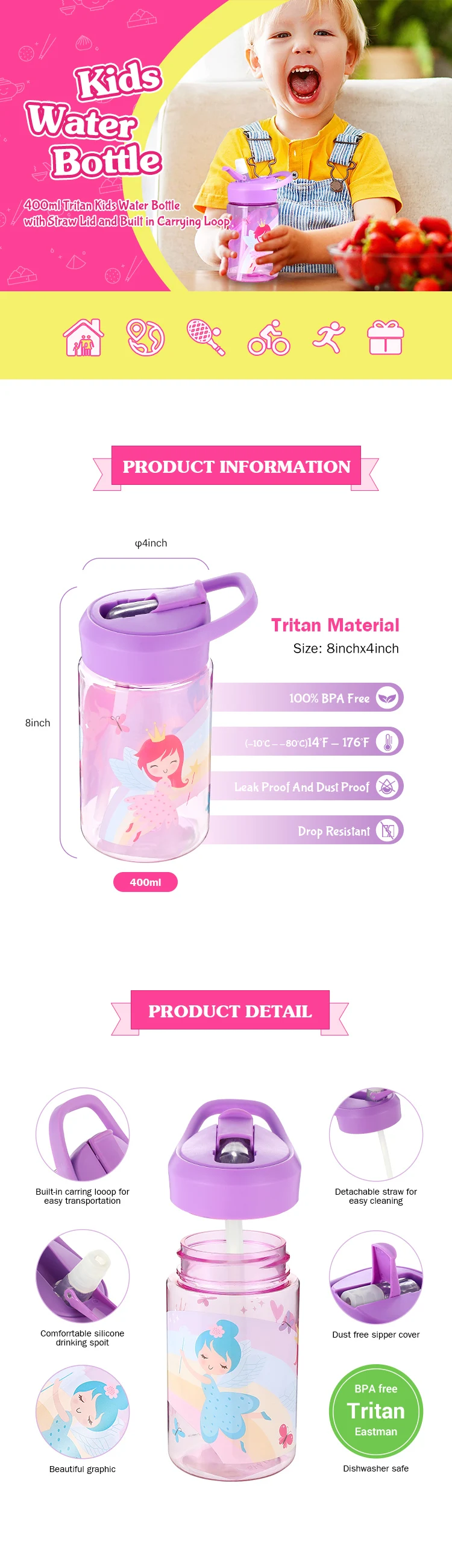 Name:400ml water bottle Tritan with straw lid Delivery time:30-45 Days after order confirmation Volume:400mlMaterialTritanOEM&ODMAcceptableColorPMS color Packing way:1pc/polybag/carton box,25pcs per carton
