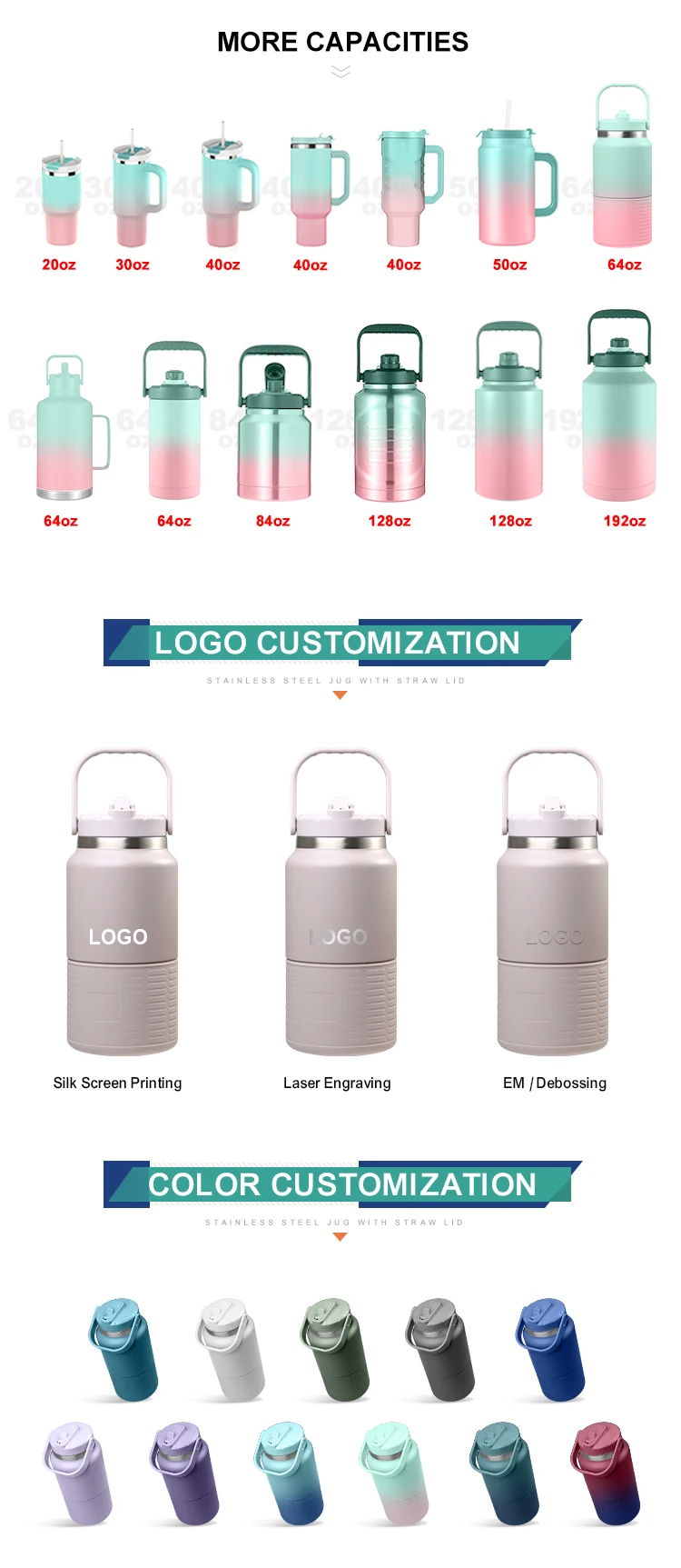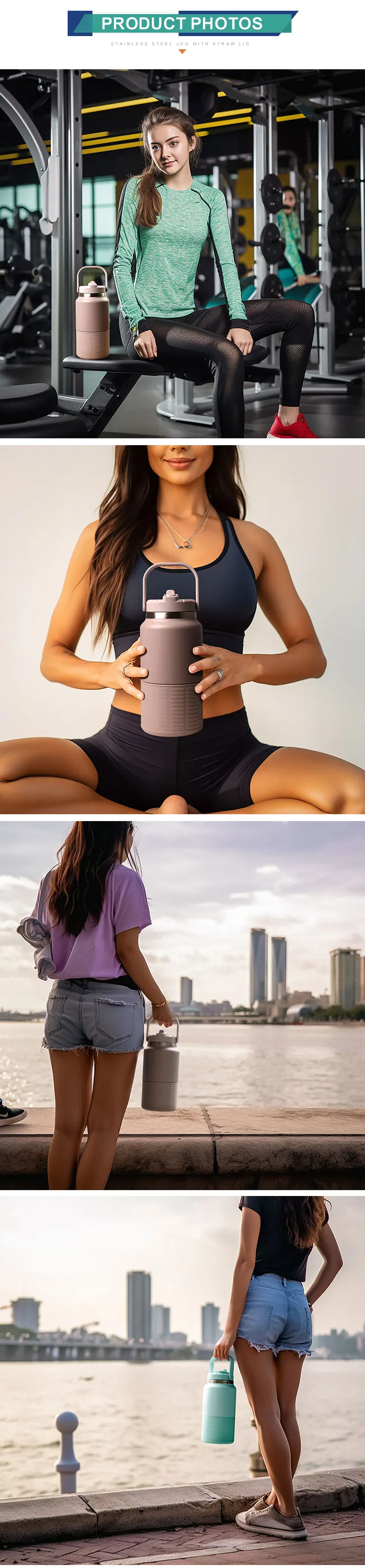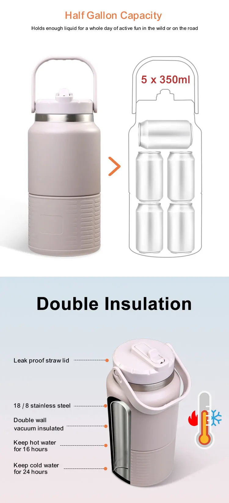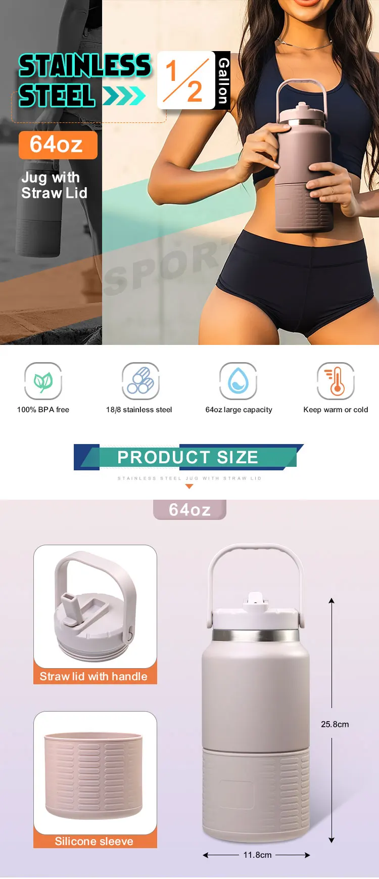 2023 Latest Half Gallon 64oz Double Wall Stainless steel Water Jug With Handle and Straw Lid and Silicone Sleeve