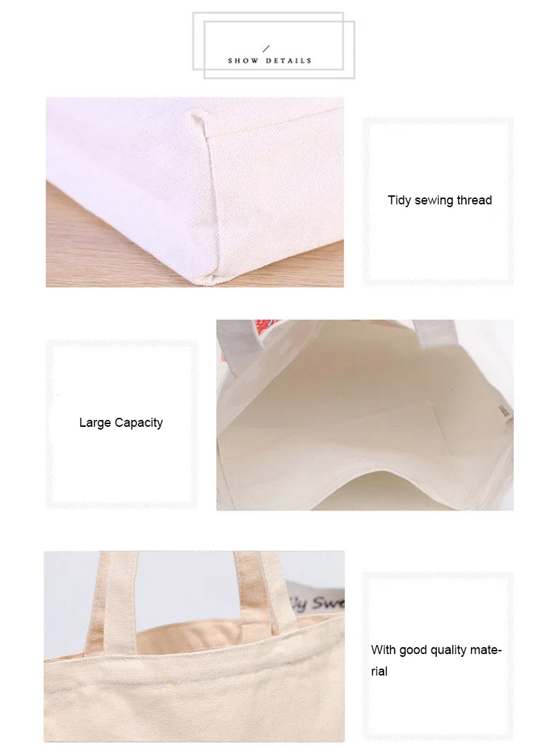 Packing Method : Individually Poly Bag Product Features : Cotton Fabric Shopping Bags, Tote Reusable Grocery Bags, No Zipper Open Type Bags, Two Soft Straps To Handle The Bag, Comfortable And Easy To Carry Product Material : Cotton Fabric Product Size : 43 x 32 x 7 cm Imprint Method : Screen Printing MOQ;300