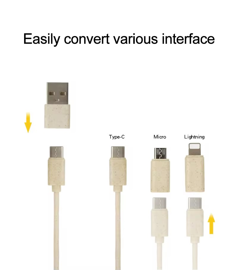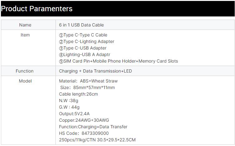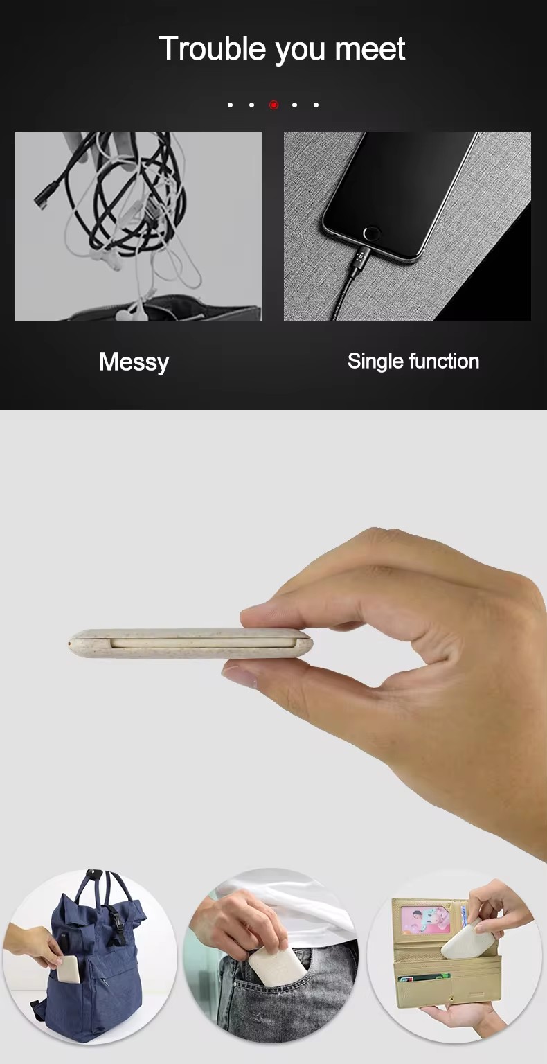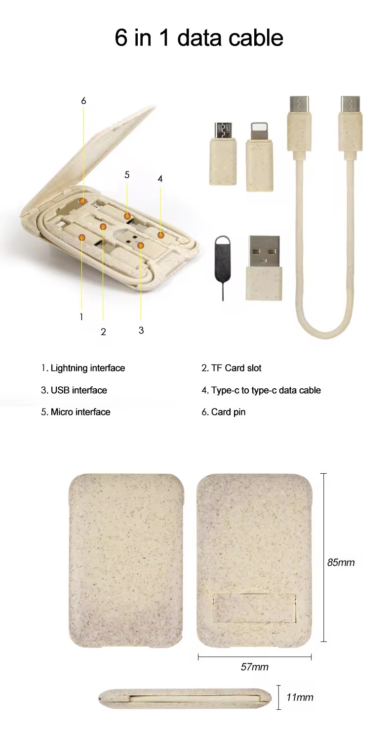 Eco-friendly Wheat Straw 6 in 1 Charging USB Cable Organizer Box Set Adapter Kit for Mobile Phone